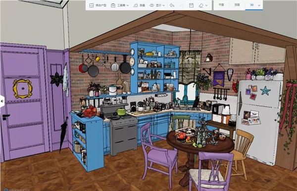 网名为“香菇油菜”的创作者表示,看过《老友记》的美剧迷无一例外都会对莫妮卡家的客厅和厨房印象深刻,“公寓的平面图网上可以找到,但客厅的素材就很少。我一边重温《老友记》,一边画图,同时还要收集很多图片模型,最后总算把莫妮卡的客厅做出来了!”