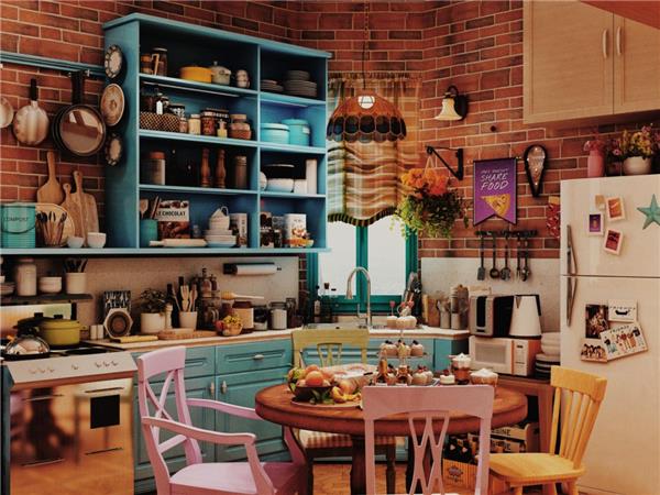 “我先把家具的位置确定好,莫妮卡的家色彩很丰富,大面积的墙体颜色是浅紫色,过道深处突然出现一抹翠绿色,复古又骚气,厨房的橱柜是湖蓝色,我特别喜欢。”