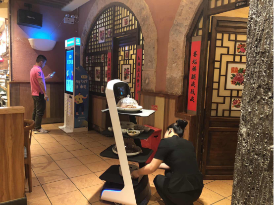 在海底捞餐厅里,送餐机器人正在给忙碌地给顾客送餐。后厨完成配菜后,直接将餐盘放置在送餐机器人托盘上,点击桌号,就能将菜配送出去,而无需专职传菜员。
