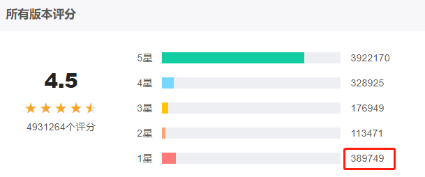 当然,这种一星差评,在微信 App 的所有评价中,所占比例并不高。文章开头的图片上,五星好评,多达 390 万,是一星评价的 10 倍。