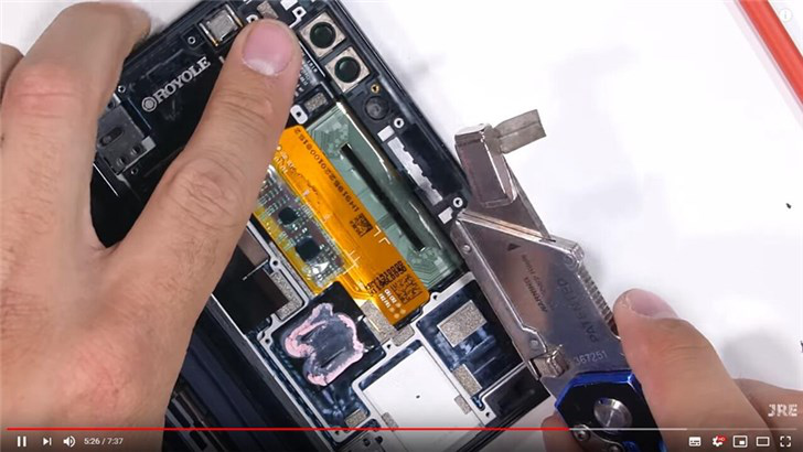 从视频来看,该机的主板位于手机的 " 左侧 " 一半(从正面看时),电池位于 " 右侧 ",两根带状电缆连接两半。最有趣的部分是铰链,其不会非常紧密地关闭(两半之间留有巨大的间隙),并且使用一块强大的磁铁来保持手机关闭。