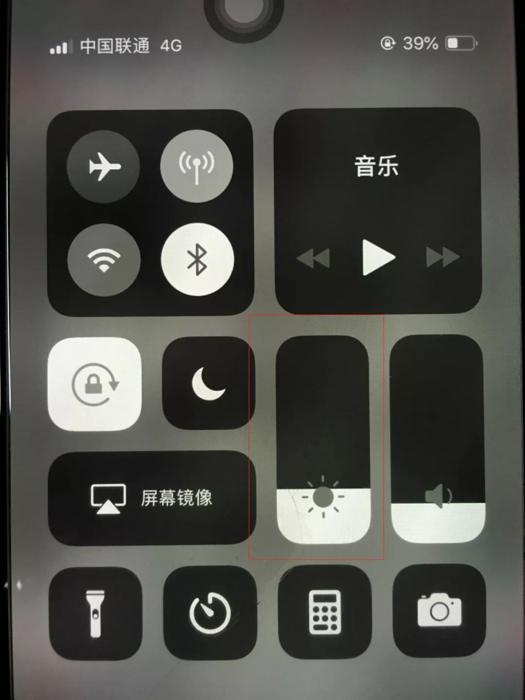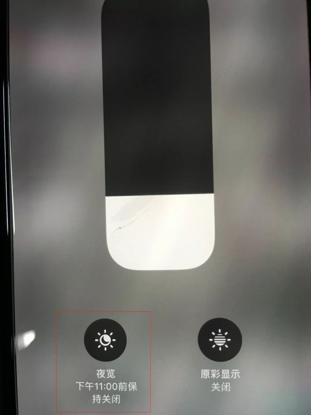 如果觉得这黑白画面太过单调,也可以长按控制中的 " 亮度调节图标 ",在底部也可以开启护眼模式,开启后画面会偏黄偏暖,夜间看起来相对更舒服,可以起到一定的护眼作用,如下图所示: