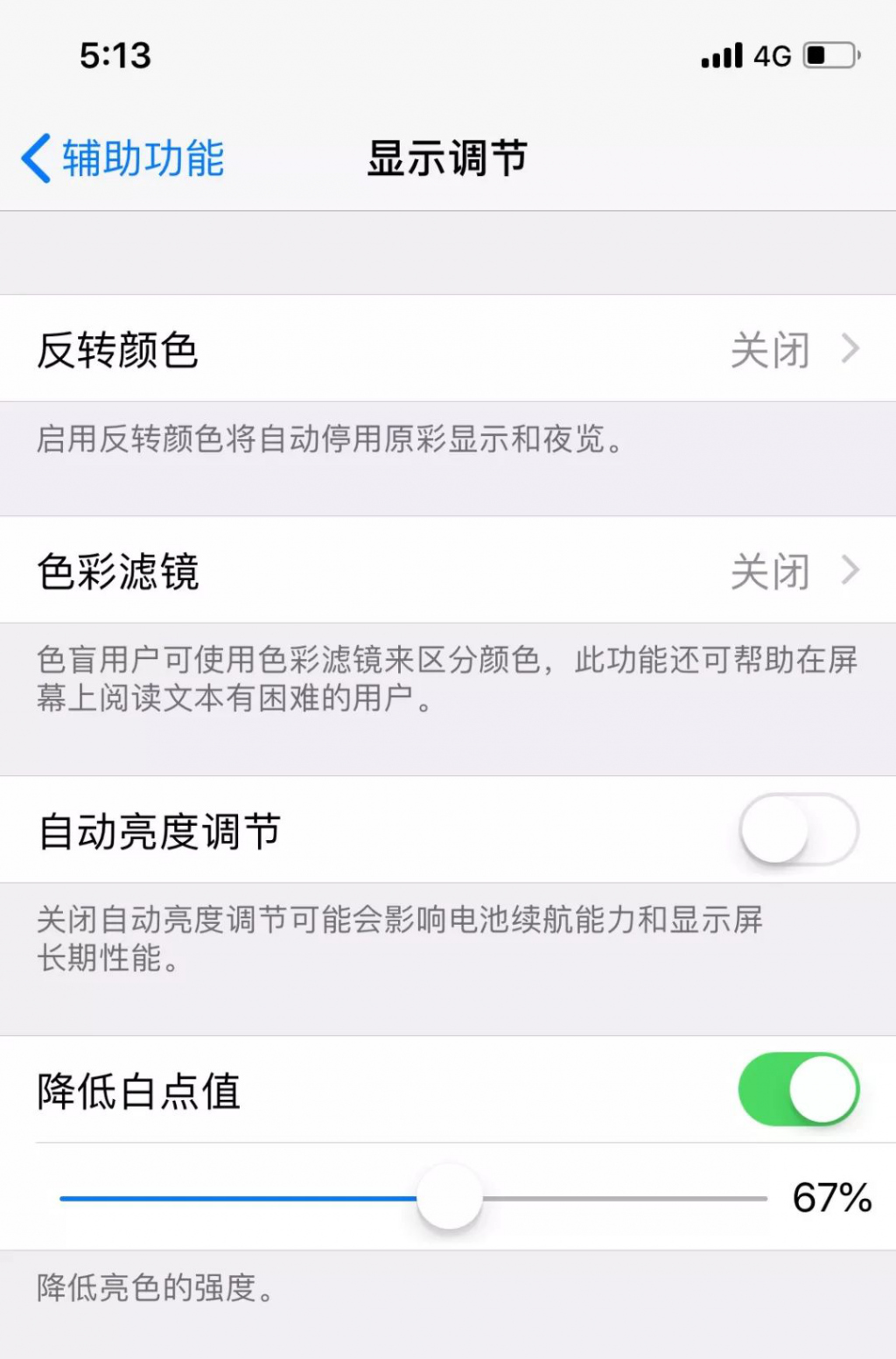 打开手机,点击 设置 -> 通用 -> 辅助功能 -> 显示调节,点击 " 降低白点值 " 就可以了: