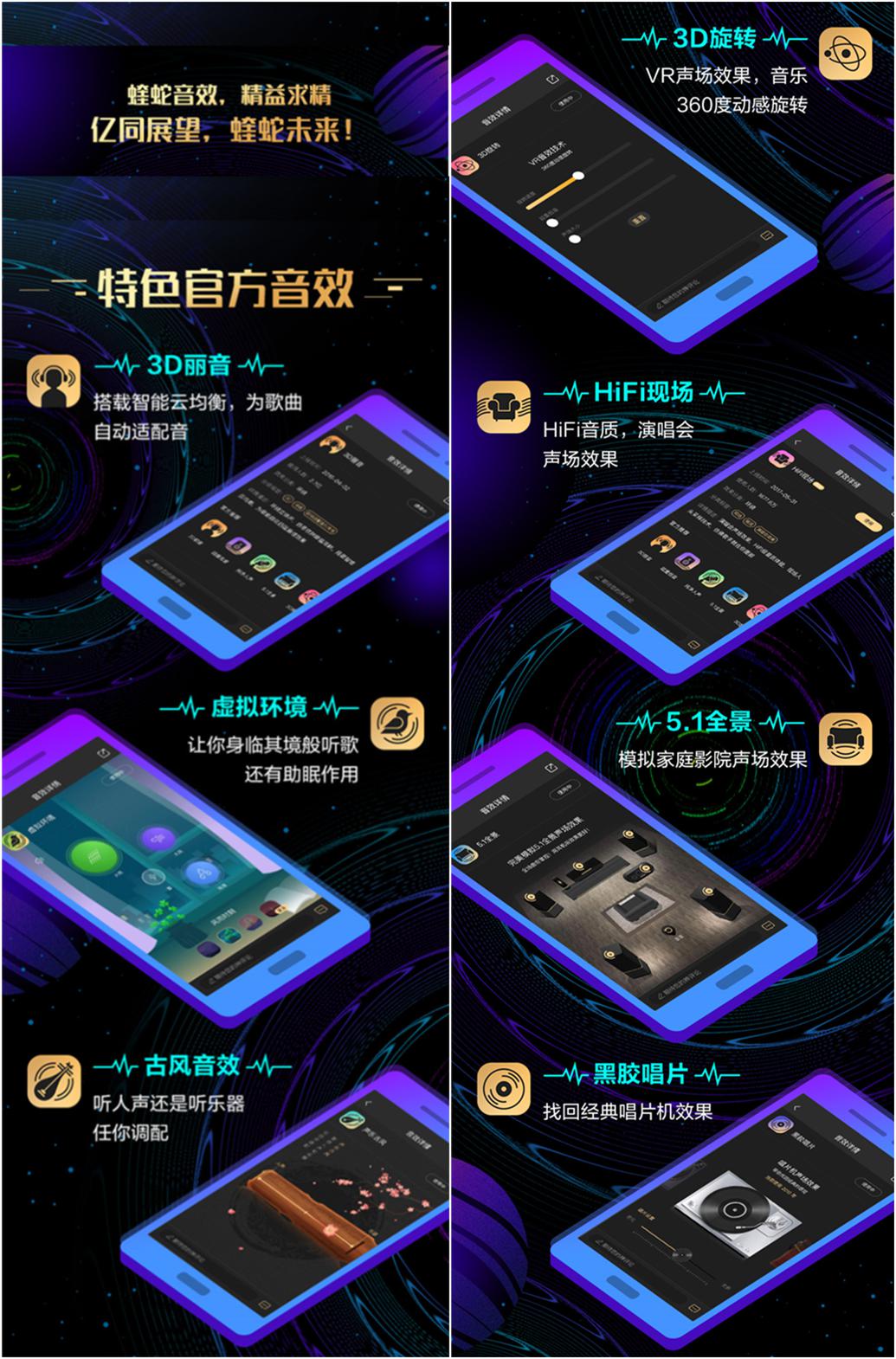 作为蝰蛇音效最早推出的系列,各具特色的官方音效为众多乐迷打开了新世界的大门,体验到原来音乐还能这么玩。代表性音效“3D丽音”搭载智能云均衡,可以为歌曲自动适配最佳效果;主打自然环境音的“虚拟环境”能为歌曲附加身临其境般的体验,还有助眠作用;全新上线的“古风音效”针对古风歌曲提供人声/乐器自由调配;独特的“3D旋转”利用VR声场效果创造奇妙的360度动感旋转音效;强调演唱会体验的“HiFi现场”使用人头采样技术创建出高品质演出声场;“5.1全景”通过声音传输变换技术在普通耳机上模拟出家庭影院的效果;“黑胶唱片”则能模拟出不同年代经典唱片机的播放质感……
