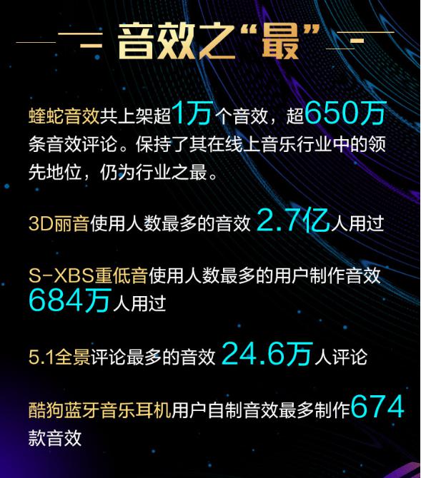 截至官方发布致谢信,蝰蛇音效内共上架超过1万个音效,音效评论数累计超过650万条,其中“3D丽音”是使用人数最多的音效,超2.7亿人体验过;“S-XBS重低音”是用户制作音效中最受欢迎的一款,684万使用过的乐迷对它青睐有加;“5.1全景”因其灵活的调配机制收获最多评论交流,共有24.6万人分享自己的调音心得;酷狗蓝牙音乐耳机在众多音乐硬件中脱颖而出,乐迷们为它制作了674款专属音效……以上数字仍在不断增大之中。无论看细分还是看整体,这些数据在线上音乐行业中都难逢敌手,以多用户与大曲库领先业界的酷狗,在音效领域仍为行业之最。