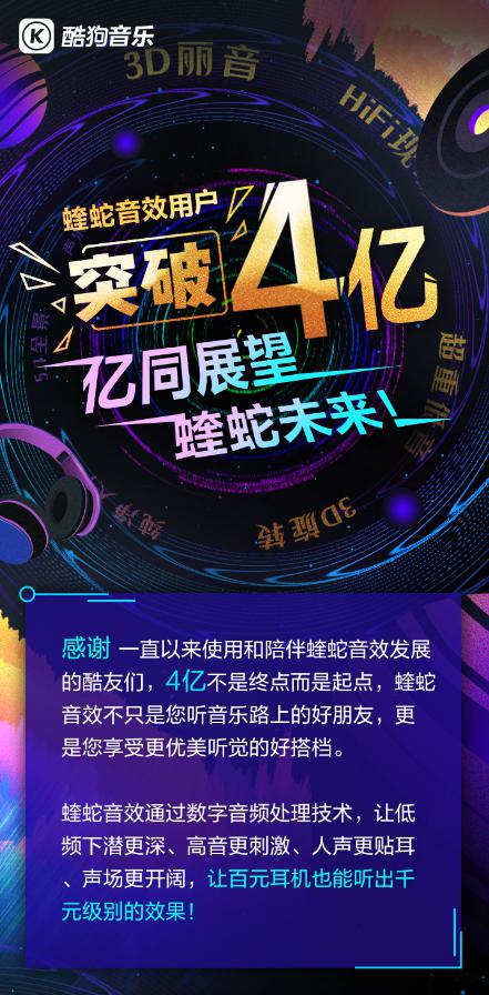 酷狗蝰蛇音效用户破4亿,官方感谢信公布行业“最”数据