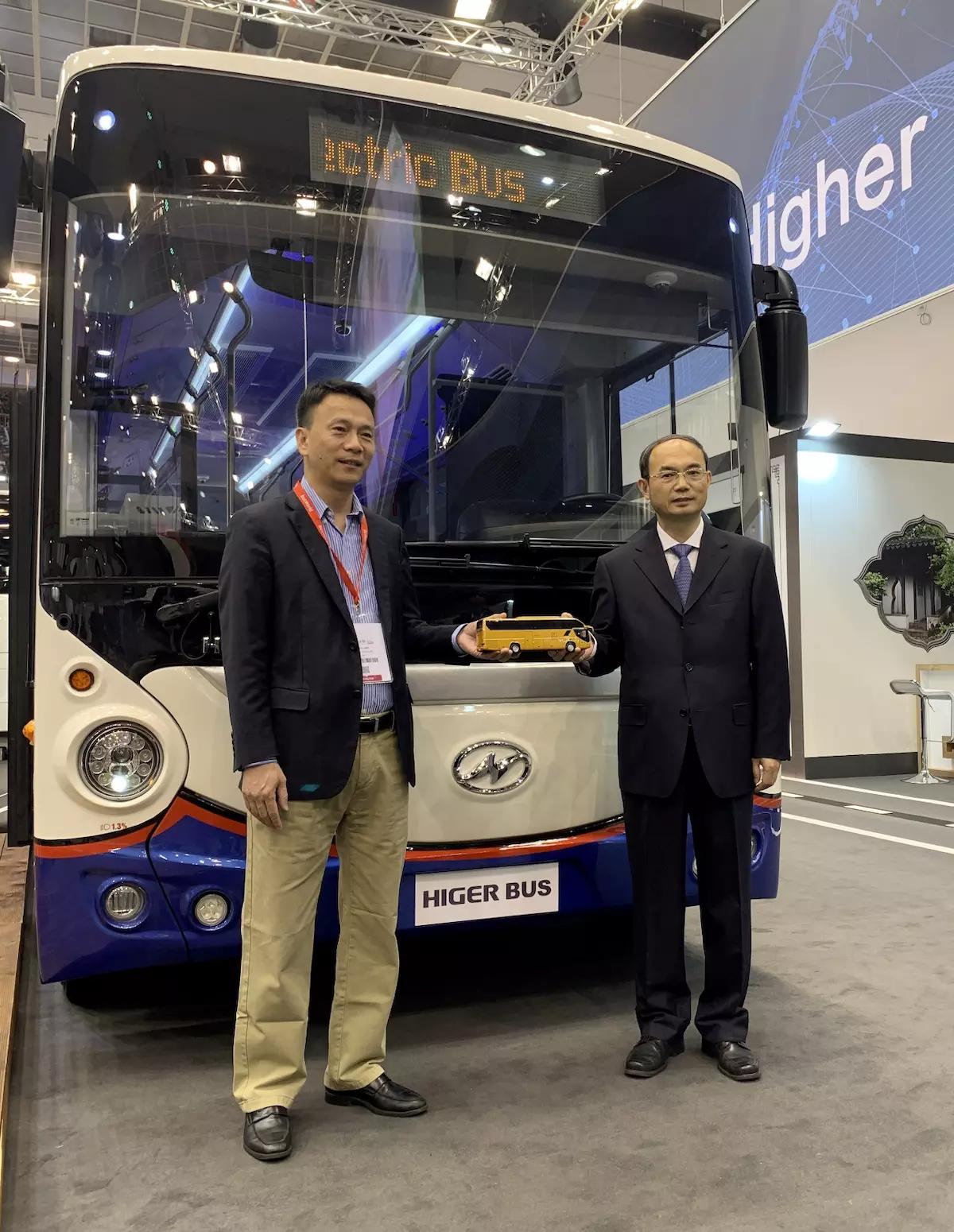 曹忠明大使(右)与苏州金龙董事长陈笃廉(左)在海格客车前合影