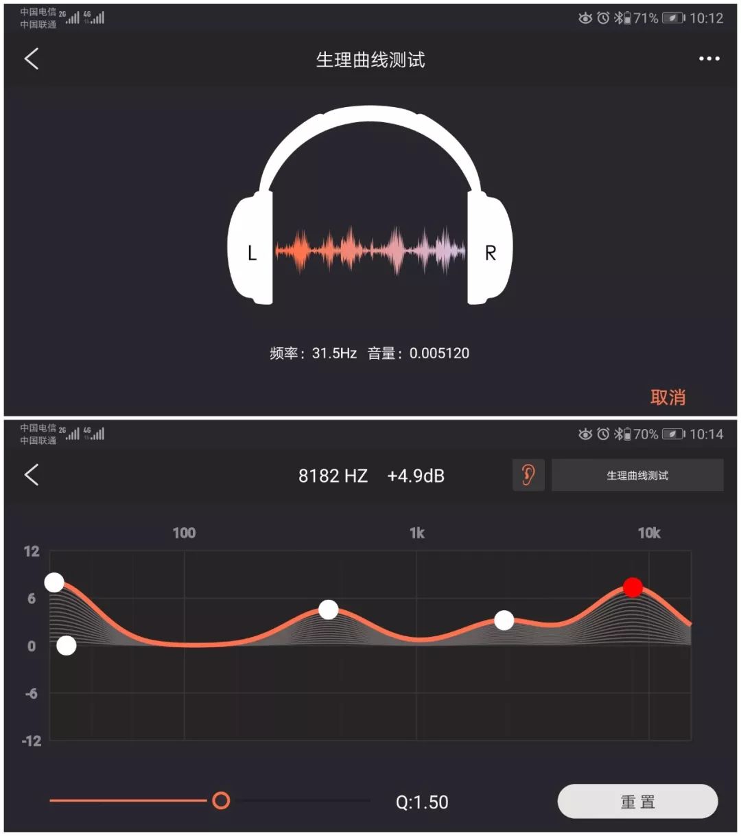APP还有个特别AI功能,在自定义EQ里针对用户不同进行的曲线测试,运用AI补偿算法计算你的左右耳听力灵敏度,生成一个符合用户需求的自定义EQ曲线,这个结果是基于ISO国际响度轮廓标准和声学实验室测试结果。