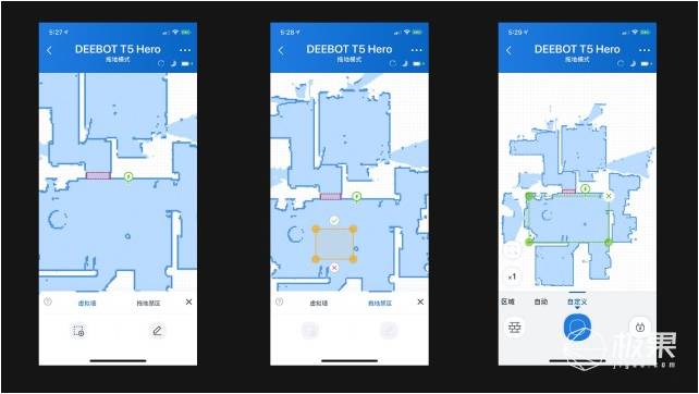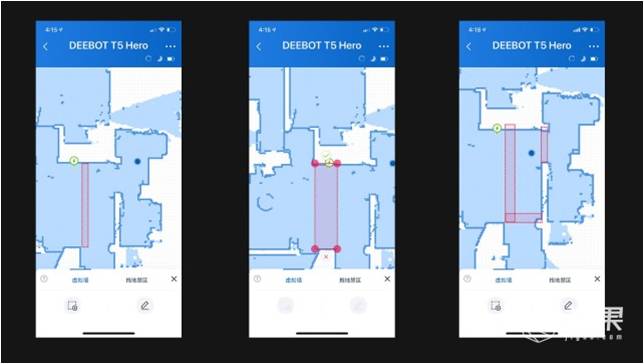 现在的APP不仅可以看到清扫地图,还能基于地图进行划区清扫、设置禁区等操作,已经是不可或缺的功能属性。在APP上设置虚拟墙后,科沃斯 DEEBOT T5到了这个地方就会调头,是非常人性化的设计。
