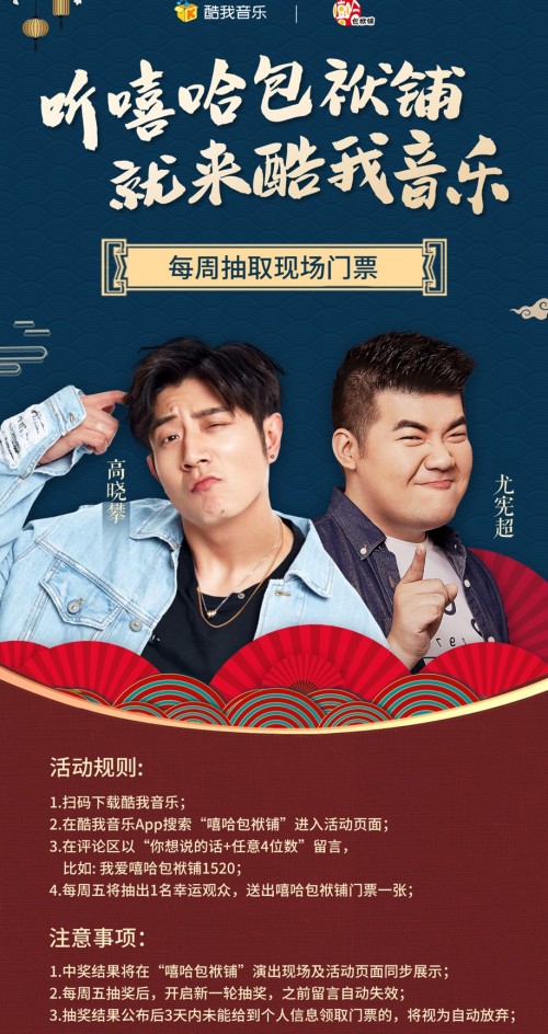 目前嘻哈包袱铺的最新创作的节目也已在酷我音乐平台上线,高晓攀/尤宪超《像个孩子》、金霏/陈曦《差不多》、周鹏飞/陈威《我要当演员》、李财/罗迦《说广告》等相声爆笑来袭,除此之外,酷我音乐还开启了一波无限火力模式的高能福利,酷我音乐将在每周五都会抽取一名幸运观众,送出嘻哈包袱铺现场门票一张,只要你是硬核相声小迷妹,就可以在酷我音乐电台听相声的同时赢取现场门票!