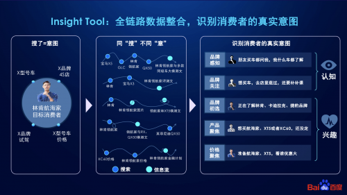 林肯汽车在此前与百度的合作中,就曾通过观星盘进行用户洞察。和其他行为相比,搜索是信息流媒体时代少见的用户主动行为,更贴近消费者意图。不过,单次的搜索还不足以判断用户真正所需要的信息,观星盘将用户在不同阶段的搜索和信息流浏览数据连接在一起,形成一条精准的意图曲线,从而清晰地洞察不同消费者的关注差异,让投放更加有的放矢。