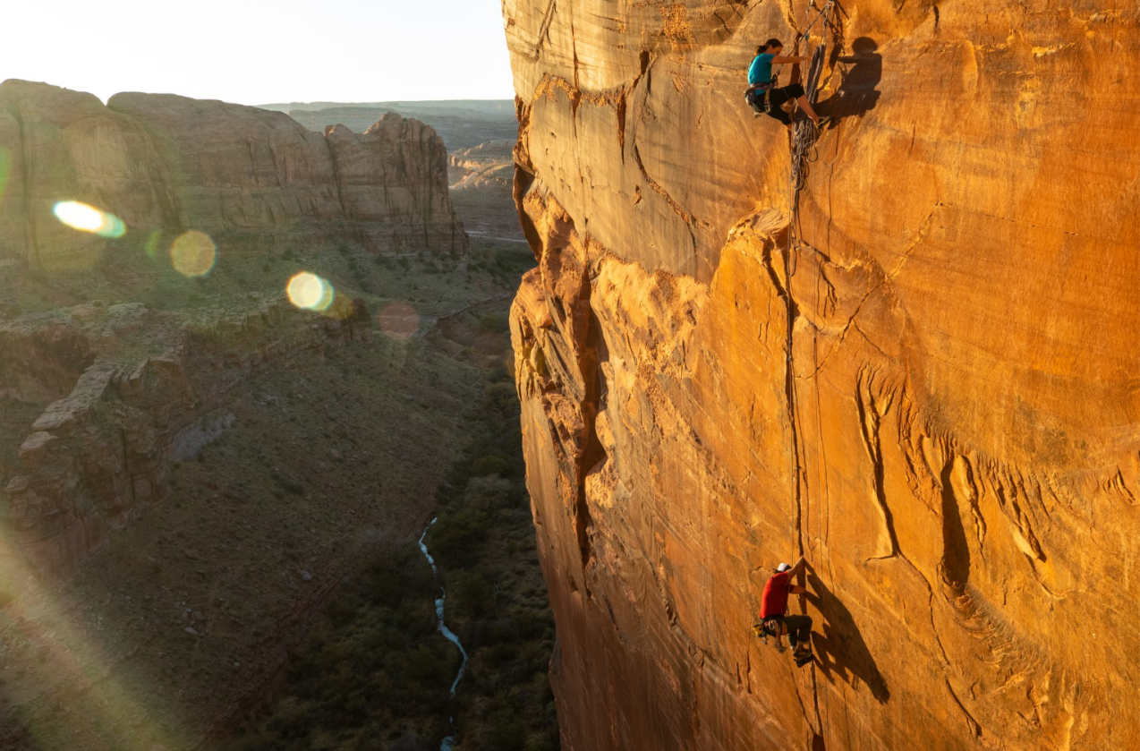 《行走人生》记录了金国威与好友 Steph Davis 一起攀岩美国犹他州摩崖镇的经历,我们可以在欣赏摩崖镇绝美风景的同时感受惊险刺激。大疆ACTION作为金国威与Steph Davis攀岩中的视频设备,记录了他们每攀登一步的艰辛,和攀登成功后的喜悦,以及“纵情一跃”低空跳伞返回地面的刺激。