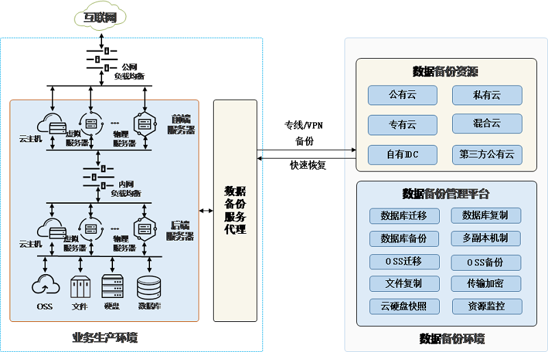 根据业务场景和备份环境的不同,京东云提供两种主要的数据备份方式:一是支持在云平台上建立数据备份环境并将用户的业务系统核心数据安全可靠地备份到云平台上。二是支持将数据通过网络专线或VPN的方式备份到用户自有的数据中心。