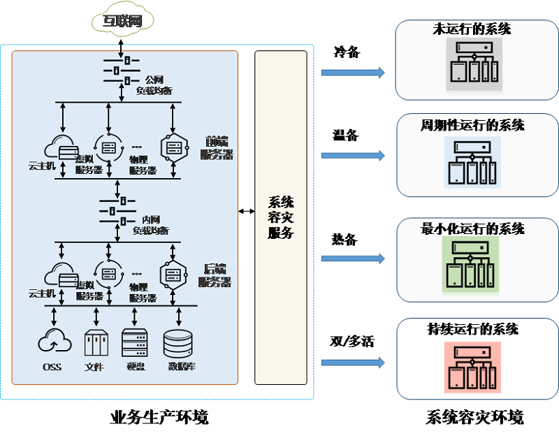 京东云支持对系统的数据级容灾和应用级容灾。数据级容灾支持对客户的数据进行备份、同步复制或异步复制,维护客户数据安全,确保严重故障发生时关键数据可用和可恢复。应用级容灾支持建立与业务生产环境相匹配的备份系统,保证故障发生时及时将业务流量切换到备份环境,使业务系统持续对外提供服务。