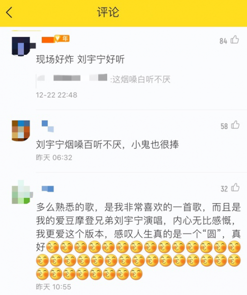 本期节目中,任贤齐周华健共同带队,双方以男女对战组合进行首轮比赛。刘宇宁、王琳凯两位新生代爱豆以一首改编后的《烟花易冷》瞬间碾压全场,大玩摇滚风配rap混搭将歌曲唱出新高度,酷我音乐评论区一时间被刘宇宁的烟嗓和王琳凯的说唱占领,纷纷表示“太上头了”!