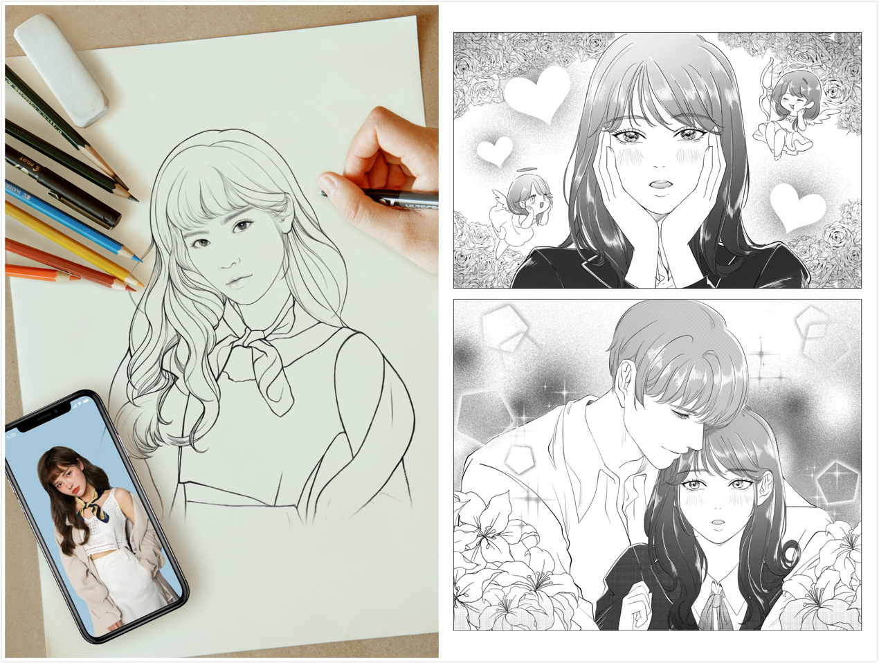 而在此技术的基础上,该功能还加入了人像线稿技术,让人像处理看起来更为手绘风格化,仿佛真的漫画效果。同时保持人脸特征的可识别度,仿佛画手绘做,尤其是线条笔触更接近艺术家手绘感,而非死板、单一线条。