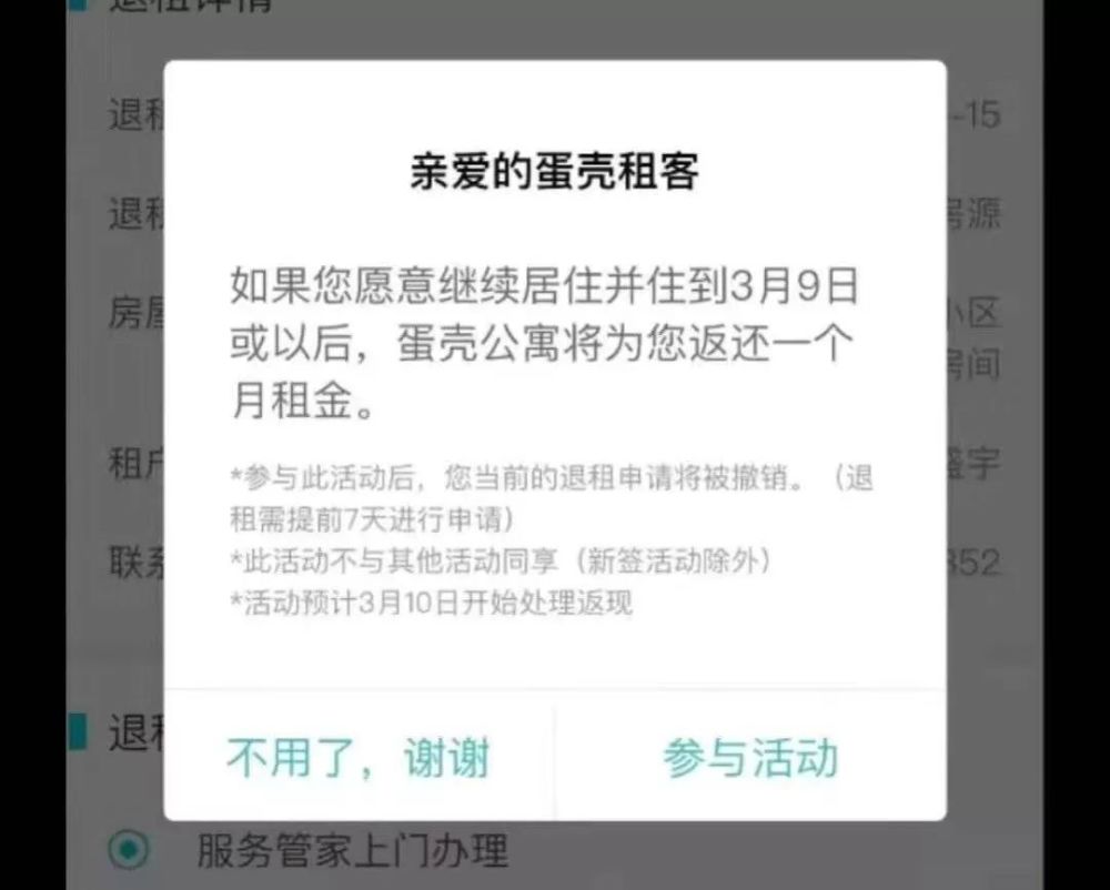 不过,也有业主反馈,蛋壳公寓这次的免租策略并非普遍。一方面,不是所有业主都收到了这个通知;另一方面,不是所有租户都可以享受这个福利。比如,北京业主常远问及两个同为蛋壳业主的亲戚后,得知他们都未接到免租电话。另有租户反馈,蛋壳公寓APP上弹出的消息是以“活动”方式,预设条件,让租客得到一个月免租期。