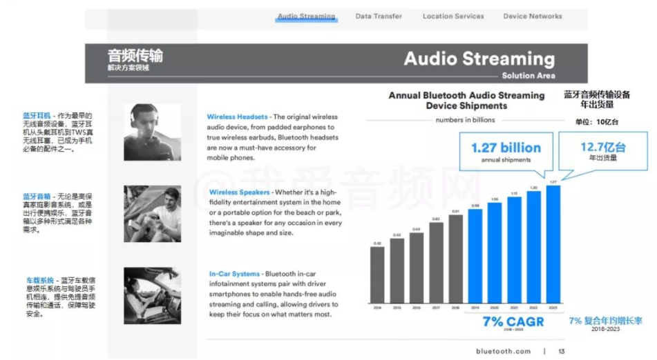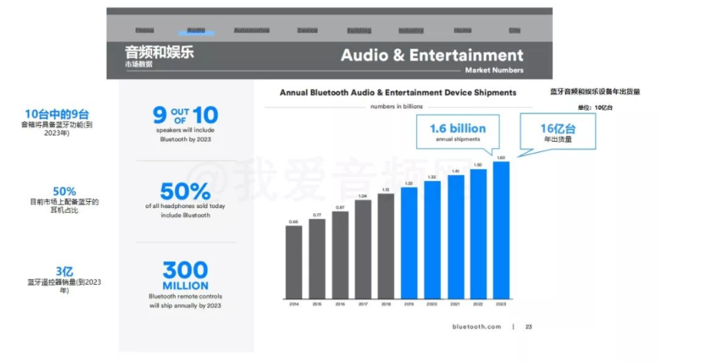 蓝牙技术联盟的权威分析,从2018年到2023年,蓝牙音频设备会以7%的复合年均增长率增长,以这种增长速度估算,到2023年蓝牙音频的年出货量将会达到12.7亿台。蓝牙耳机 – 作为最早的无线音频设备,蓝牙耳机从头戴耳机到TWS真无线耳塞,已成为手机必备的配件之一。蓝牙音箱 – 无论是高保真家庭影音系统,或是出行便携娱乐,蓝牙音箱以多种形式满足各种需求。车载系统 – 蓝牙车载信息娱乐系统与驾驶员手机相连,提供免提音频传输和通话,保障驾驶安全。