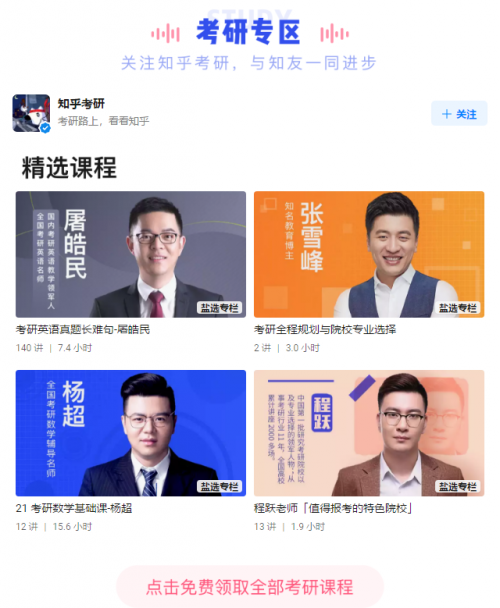 为备战2021年考研,高校学子们分秒必争。在知乎“放着我学”专题活动的考研专区中,知乎精选多名全国考研名师的优质课程,提供免费借阅。既有张雪峰老师的”考研相声“,帮助考生闭关规划考研,还有徐涛、杨超、程跃等老师送上的精品课程和直播,为基础课备考开个好头。从学科题库讲解到院校专业选择,知乎为广大学子在战“疫”宅家期间准备好了充足的考研养料。