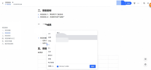我们的工作主要围绕项目进行,所以项目规划表十分重要。现在我会在项目规划表中把项目拆解分工,并在表内@相关参与同事,同时点击左侧的小圆圈A,插入相关的项目甘特图、图片以及其他文档。向上级汇报时,领导看完项目规划表,就能了解我们的项目情况。