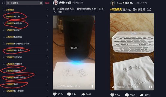 宅家已久的用户们纷纷用天猫精灵玩起了“我想你猜”、“猜人物”,随便翻一翻,抖音上到处有点赞量几万甚至几十万的挑逗天猫精灵的小视频,以至于以“天猫精灵”为搜索词的热搜榜单上,一半都是搜这个的。
