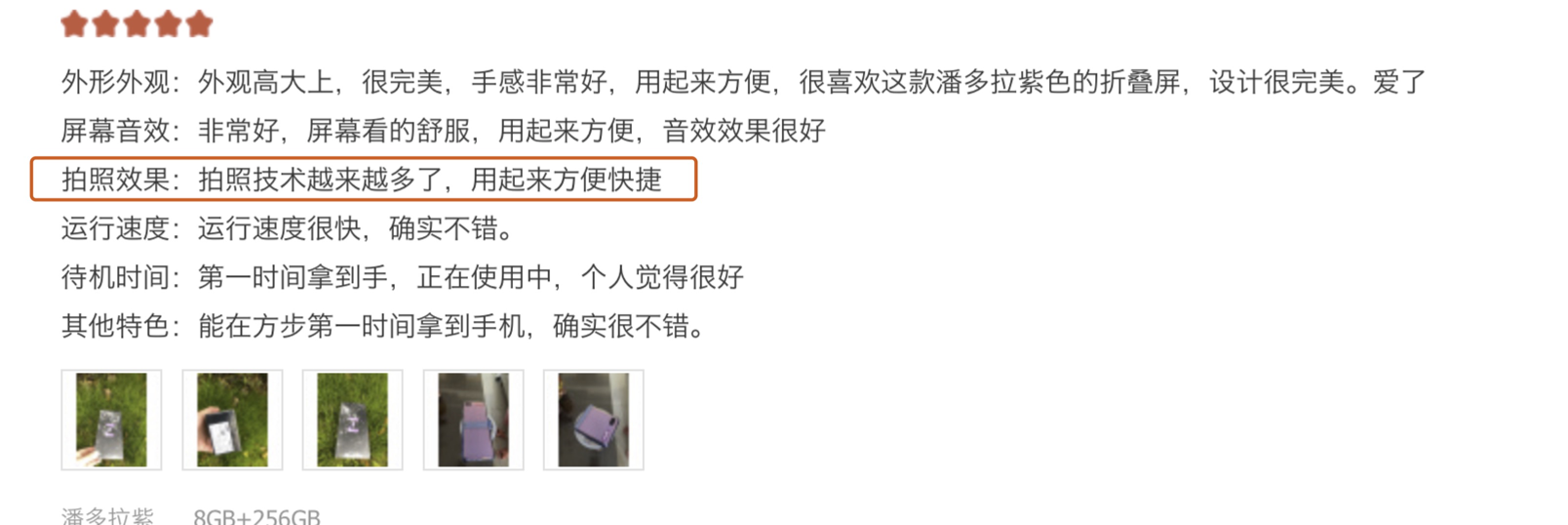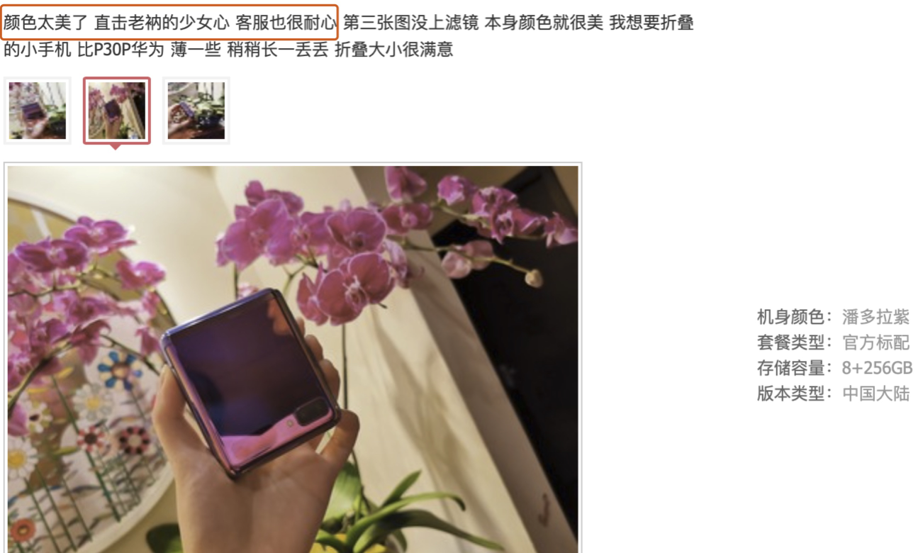 在京东商城,三星Galaxy Z Flip的好评率达到了98%,而在天猫上,三星Galaxy Z Flip目前也拿到了5分的满分成绩。究竟这款新机表现如何,不如一起来看看当前用户怎么说。诸多晒单中,几乎所有用户都被三星Galaxy Z Flip精致时尚的外观所折服。其中一位京东用户表示“颜色太美了,直击老衲的少女心”。另一位手机玩家则大赞三星Galaxy Z Flip时尚外观真的很惊艳,是他见过最亮眼的手机。