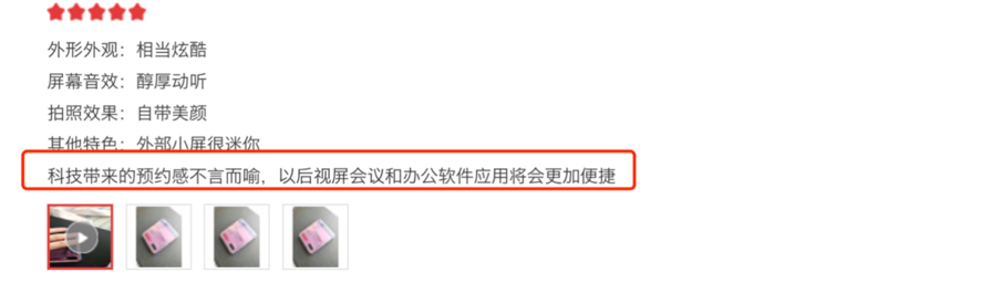 三星Galaxy Z Flip的交互体验,更是给很多用户带来了惊喜,其拥有的自适应分屏模式,可以将单一程序分为预览区和操控区,让拍摄等操作更加便捷和高效。还有消费者表示三星Galaxy Z Flip大大提升了她的工作生活效率,开启多任务处理后,他可以很方便地一边视频会议一边办公,声称用了这个功能就回不去了。