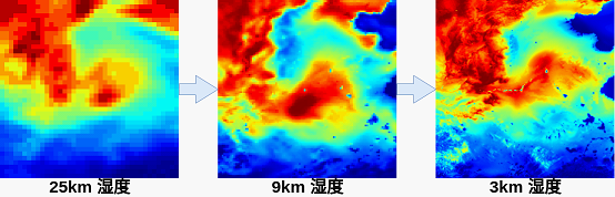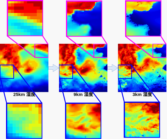 超分辨率技术,是将一张低分辨率的图像变为高分辨率。通过估算网格密集化后,补充缺失的像素值。以下是数值模式降尺度的示例,可以发现,和超分辨率相似的是,降尺度的过程令图像变得清晰。