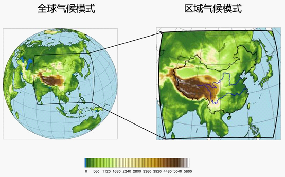 天气数值模式的输出是矩阵形式,可以用图像的方式可视化。同一片区域矩阵数值越密集,代表这个区域预测的细致程度越高。如下图展示了全球模式和区域精细预报之间的关系图。