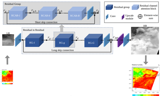 上海眼控人工智能研究院以超分辨率网络为主干网络,针对不同的数据类型调整网络中的长跳跃连接和短跳跃连接。用转化为图片后的某一维度的25km全球模式的气象预报和3km的对应地区和时间的降尺度数据来训练超分辨率网络,以捕捉这一区域该维度的25km全球模式与3km降尺度后的数据间的映射关系。其中针对通道的特征先进行一个空间的全局平均池化得到一个 1×1×C的通道描述;接着,再经过一个下采样层和一个上采样层得到每一个通道的权重系数,将权重系数和原来的特征相乘即可得到缩放后的新特征,整个过程实际上就是对不同通道的特征重新进行了加权分配,通过这种channel attention的机制进行特征融合,最终生成的气象图片很好的生成了特征的轮廓和细节部分。