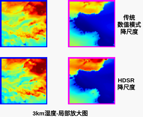 让我们放大9km格点间距那张图中,蓝色和紫红色的框,我们的结果和数值模式一样,模拟了物理过程,生成了输入图中不存在的信息。DHSR模型生成的信息和耗费大量计算资源的数值模式非常接近。