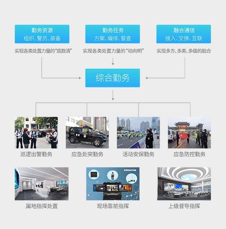 ·全面实战化:全面贯彻“情报、指挥、勤务一体化”的建设思路,以多维数据研判、媒体融合通信、统一勤务服务为抓手,夯实综合勤务调度、警情指挥处置、情报分析研判等实战业务中的情指勤一体化能力。
