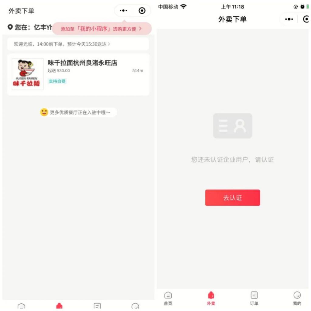 不过,这一功能在 5 月 12 日突然关闭,如今再进入外卖下单页面,只允许合作企业的员工在认证后进行下单。