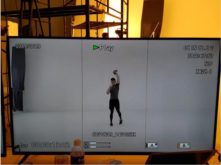 “比如’滑雪跳’这个动作,它看似简单,然而拍摄起来非常麻烦。摄影机的监视器中央会有一个准心,每次动作开始前,这个准心会对准模特,后者要做的,就是在保证动作完成足够标准的情况下,双脚每次跳跃的距离完全一致,不能出现偏差。在动作结束回到原点后,还依然能站回到监视器中央的准心上。”