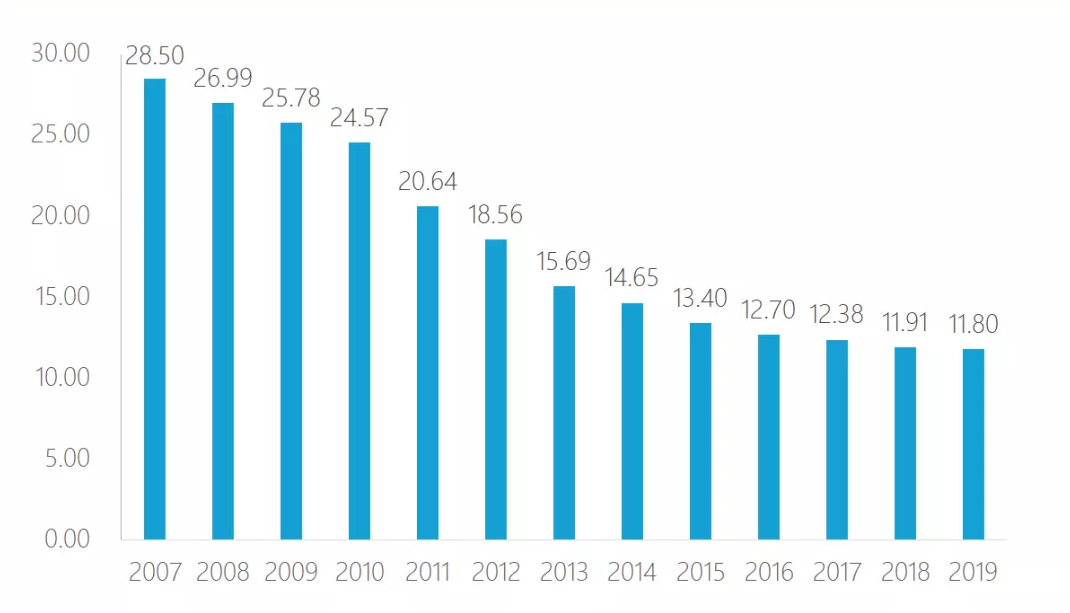 国家统计局的数据显示,快递行业平均单价已由2007年的28.5元/件,降至2019年的11.8元/件。