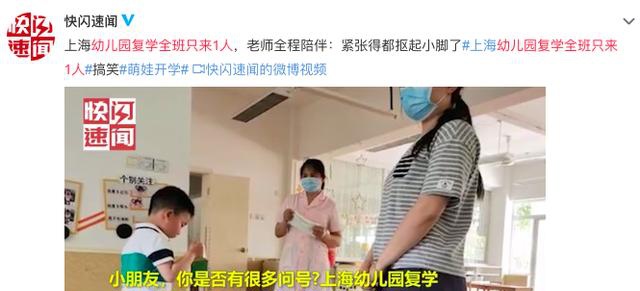 上海一家幼儿园开园后,全班38个同学只有一名小男孩返校上课,近一百平方的教室只有这名同学和两名老师:一人上课,一人吃饭,一人睡觉,老师全程"二对一"陪伴,小朋友紧张得小脚都抠起来了,吃瓜网友都被这个小朋友给逗乐了。