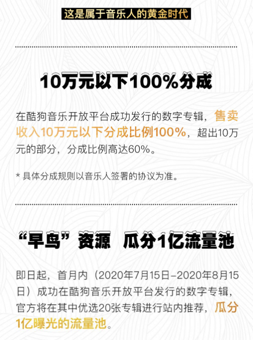 据介绍,音乐人或机构在入驻酷狗并成为“酷狗音乐人”之后,就可以在“酷狗开放平台”中进行自主发行数字音乐专辑,并自行定价。值得一提的是,在10万元以下的专辑售卖收入将100%归加入该计划的音乐人所有。