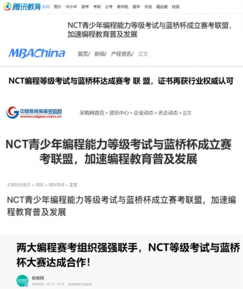 2020年5月,NCT全国青少年编程能力等级测试再获工信部人才交流中心赛事认可,与国内权威的蓝桥杯大赛青少组成立赛考联盟,共同致力于青少年编程教育普及,探索青少年编程教育的可持续发展,目前所有NCT成绩通过的考生可直通蓝桥杯大赛青少组指定赛项省赛。