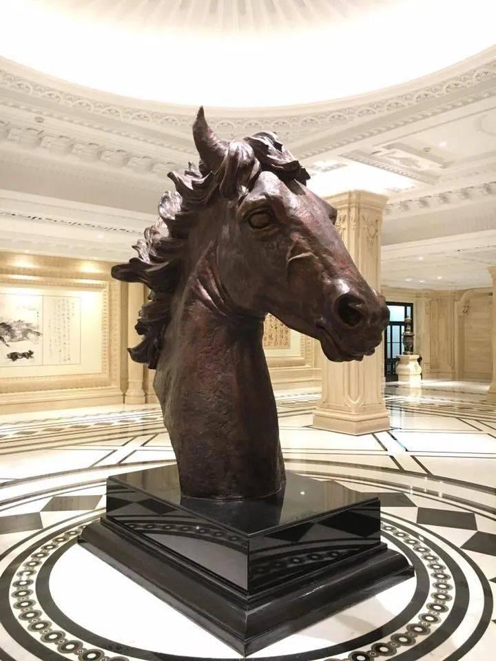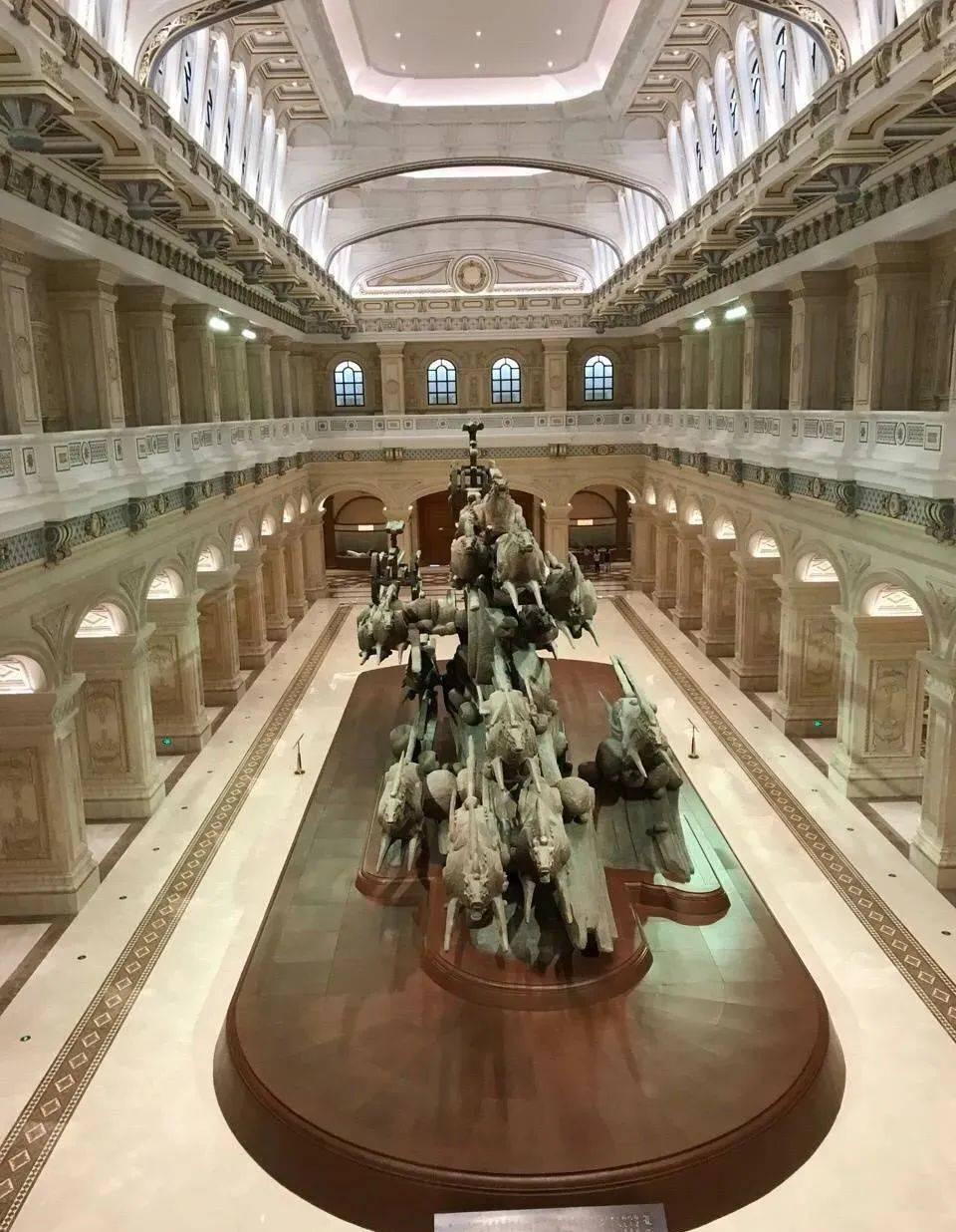 在这个建筑一层的正中间,盛放着一座重达 400 吨重的纯青铜飞马奔腾雕塑。雕塑的四周就是名马馆。