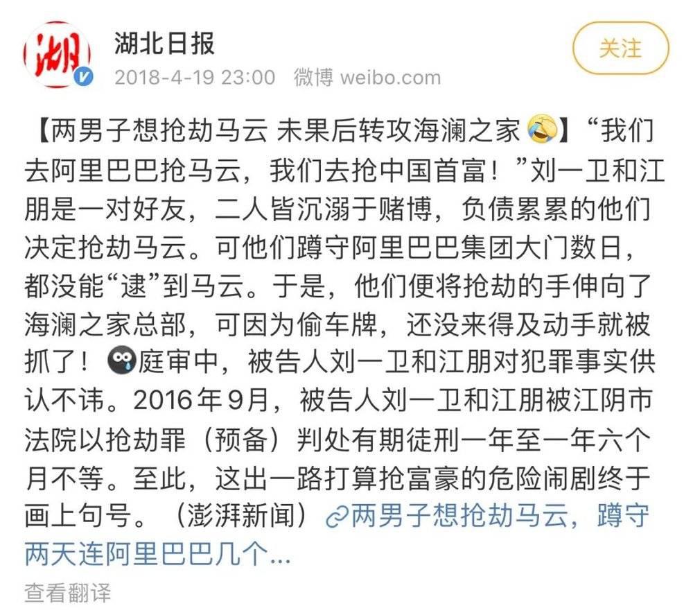 两人劫匪想抢劫马云,未果后转攻海澜之家。两人蹲守在阿里巴巴集团大门数日,都没能 " 逮 " 到马云,于是,他们便将目光转移到江阴海澜之家总部。