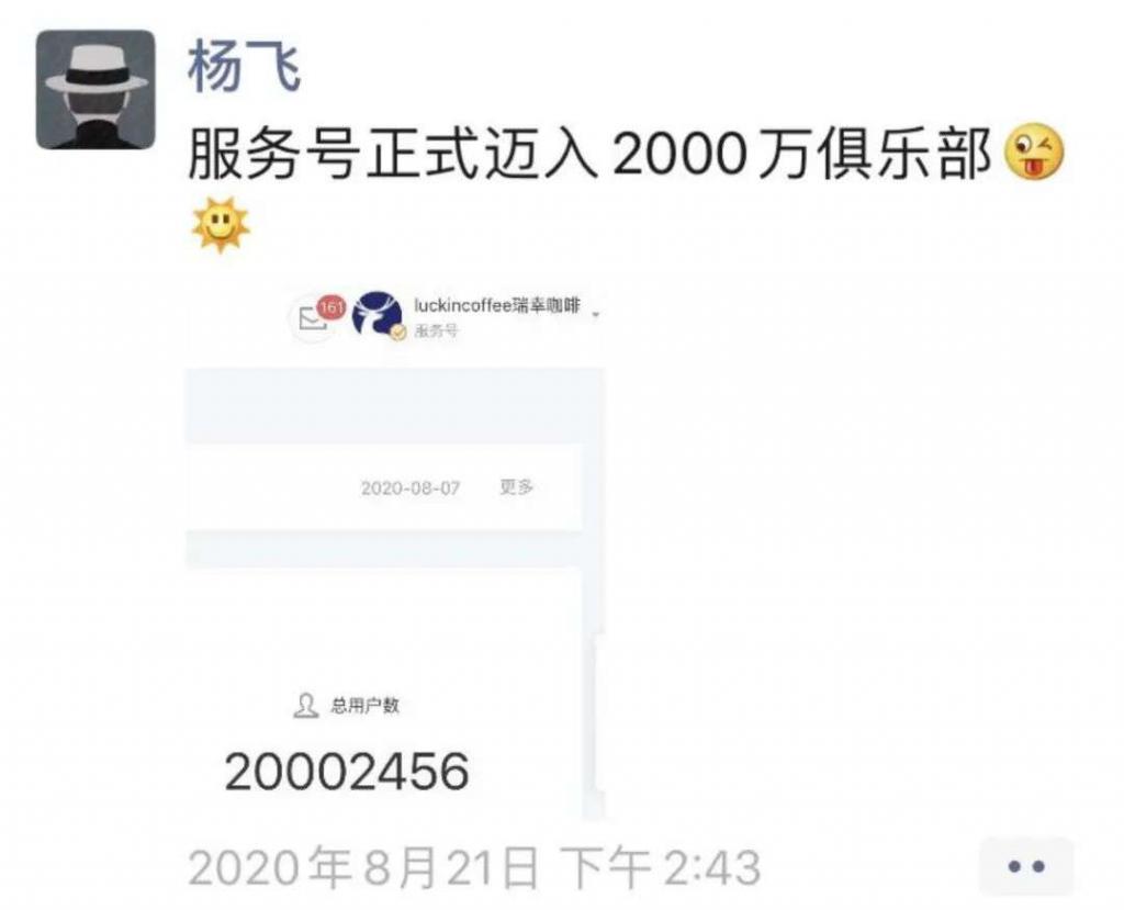 杨飞在增长上的确是一把好手,8 月 21 日,杨飞在朋友圈晒图,瑞幸咖啡公众号粉丝突破 2000 万,而在私域流量上,瑞幸利用企业微信进行社群营销,到 7 月底,已经有 180 多万私域流量用户,其中有 110 万加入到了 9100 个围绕门店组建的用户福利群,而这个数据,还在以每个月 60 万的数字在新增。