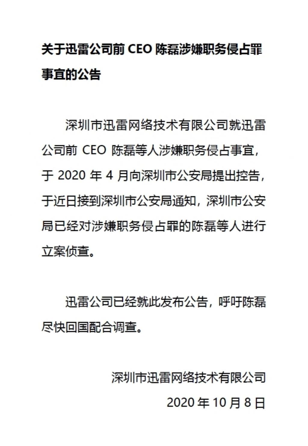 陈磊在加入迅雷六年后被前东家以贪腐起诉。10 月 8 日,迅雷发布公告称,深圳市公安局已对涉嫌职务侵占罪的公司前 CEO 陈磊等人进行立案调查。