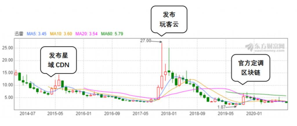 直到 2019 年 9 月,迅雷股价已经持续跌到 2 美元左右,之后的 10 月股价迎来一波小回升,主要是来自官方将区块链定调为核心技术自主创新重要突破口的带动,不过迅雷本身的区块链业务并没什么波澜泛起,很快其股价就回落了。