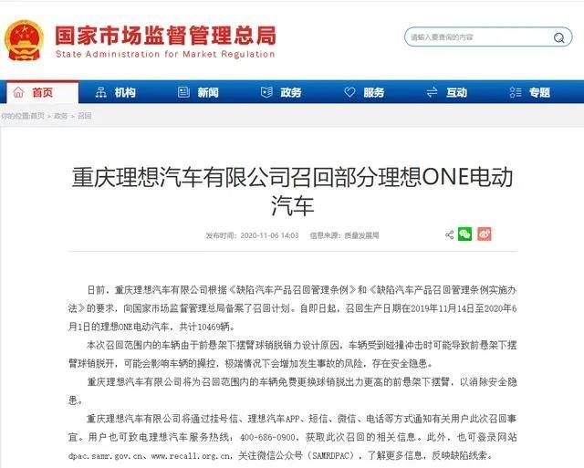 11月6日下午,国家市场监督管理总局官网公告了理想汽车的召回信息,宣布自即日起,召回生产日期在2019年11月14日至2020年6月1日的共计10469辆理想ONE电动汽车。