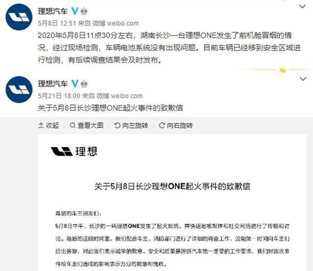 值得一提的是,8日,一辆理想ONE在长沙街头自燃,从网上流传的图片及视频可以看出,车辆前机舱出现了明显的起火现象,但是理想汽车在官微中的却称此次事故为"前机舱冒烟"。后来在"车内漏水"发生时,有网友借此调侃其为"只是车内湿度较高,并无其他影响"。同月21日,理想在发布的致歉信中,又改口称该事件为"起火事件"。