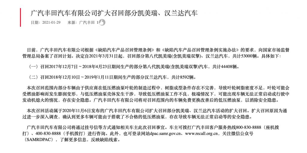 1 月 29 日,广汽丰田汽车有限公司宣布召回 53000 辆凯美瑞和汉兰达汽车。