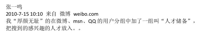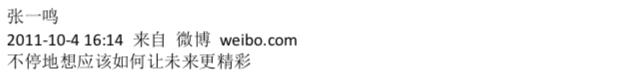 许多媒体稿中形容张一鸣会用到一个词 "平实",而我在他尤其是 10 年的微博中读到了大量的小火苗和当今舞厂的影子。他在九九房时代对自己生活记录的很多,感觉成长飞快,是一个有活力且未来可期的年轻人;可惜后来社会地位升高后讲话越来越谨慎,就变成了转内涵段子为主。不过文中能汲取到的片刻真思,依然值得我们细细品味。