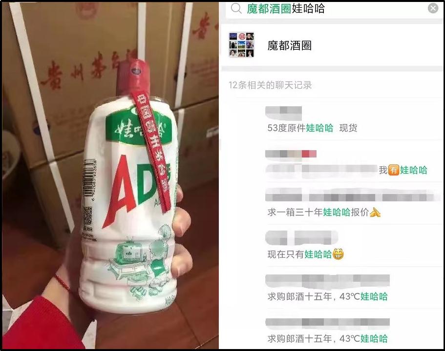 很多茅台黄牛群赶紧偷偷改了群名,改成 " 娃哈哈群 "、" 农夫山泉群 ",还给飞天茅台改名了,拿 " 娃哈哈 "、" 农夫山泉 "、" 矿泉水 " 当暗号。