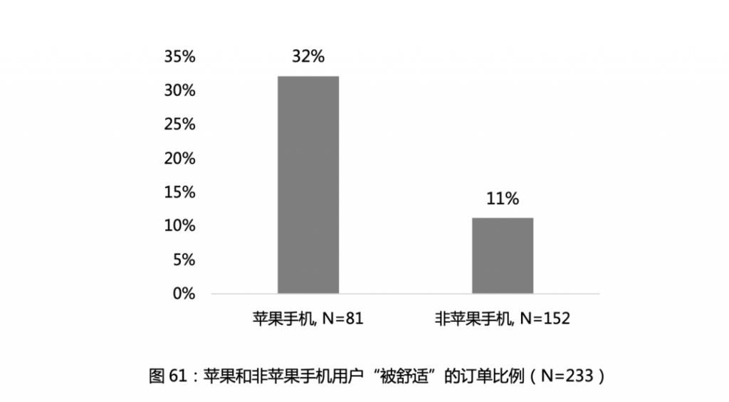 在进行的 233 次实验中,iPhone 用户被派单舒适型车辆的概率为 32%,而非 iPhone 用户被派舒适型单的概率仅为 11%,舒适性车辆费用通常更高。如用户使用的不是 iPhone 时,则根据手机价位,价位越贵的手机越有可能被派舒适型的单。