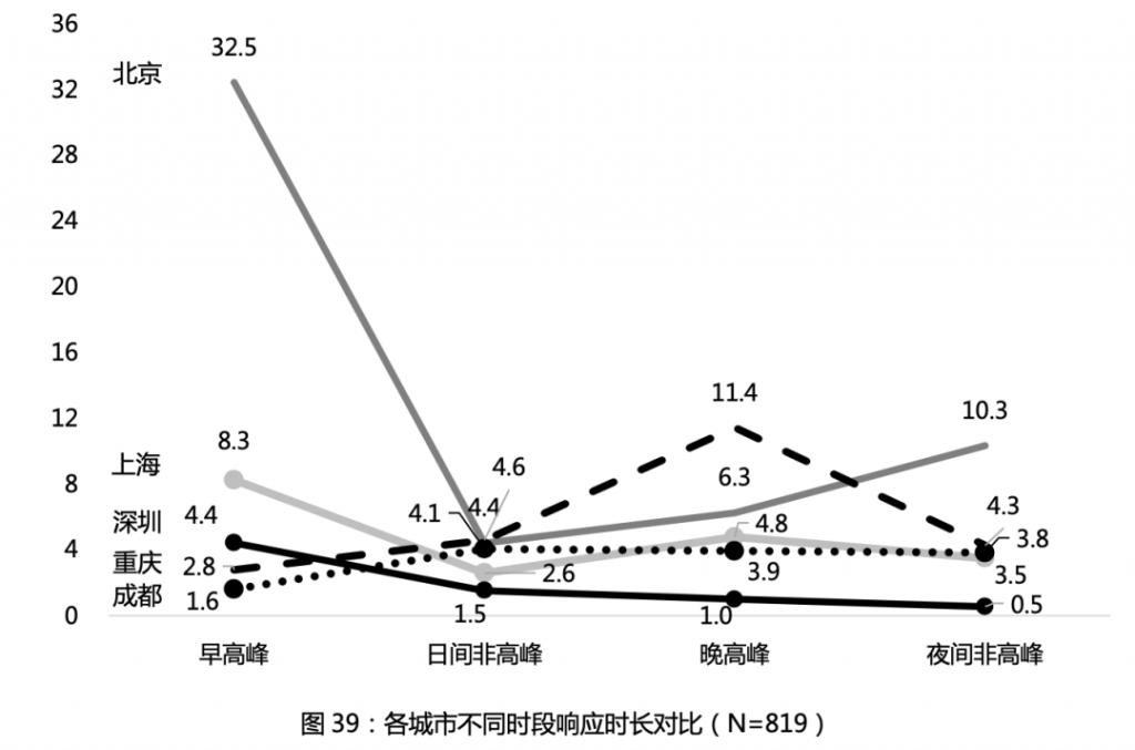时隔五年,孙金云团队调研的结果显示,今天的北京仍是中国最难打车的城市,早高峰期间,北京平均等待时间约需要 32.5 分钟,上海约为 8.3 分钟,深圳为 4.4 分钟,重庆 2.8 分钟,成都 1.6 分钟。